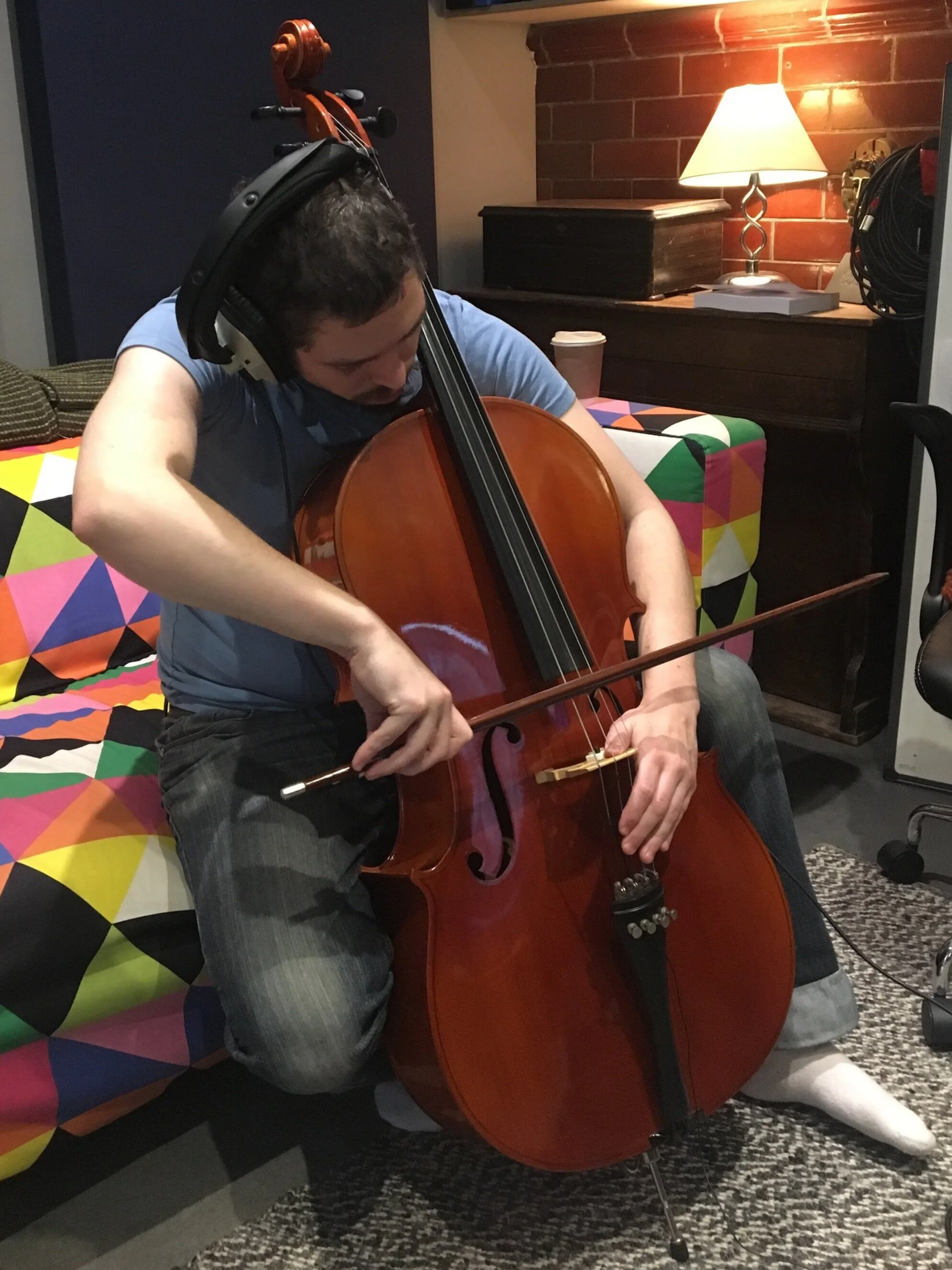 Benjie’s trusty Mandolin was called into action, e-bowing its way into becoming a main sonic feature of the score, whipping and gritting its way to the foreground as well as providing pedal type structures on which other elements could take the stage. A wonderful recording session of multi-tracked strings went into creating the musical logic for much of the chordal movement in the score, notably underscoring the finale as well as a few other key moments in the drama. This recording was based on a tight mathematical formula which was rigidly held to, emulating how we thought the character of Donny might go about writing music. Alongside this was an exploration into various layers of beeping and juddering textures with which we hoped to convey his thought patterns, and for the more intense moments in the film a more electronic sound was required. Whenever intensity is needed we tend to lean on Native Instruments’ brilliant array of software synths in order to create a growling sense of unseen threat and fear at key moments. That coupled with my knowledge of EDM production, and by fusing the already existing musical elements together, we were able to create some powerfully dramatic moments that we’re very proud of.